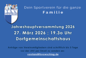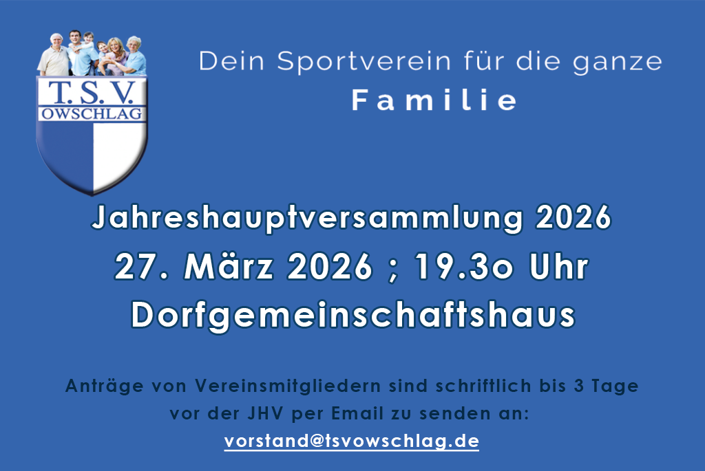 Am Donnerstag, den 27. März 2025 lädt der Vorstand des TSV Owschlags zur diesjährigen Jahreshauptversammlung ins Dorfgemeinschaftshaus Owschlag, Sportallee 2a ein. Beginn ist um 19.3o Uhr. Anträge von Vereinsmitgliedern sind bis 3 Tage vor der JHV schriftlich an den Vorstand an folgende E-Mail Adresse zu senden: vorstand (@) tsvowschlag.de.