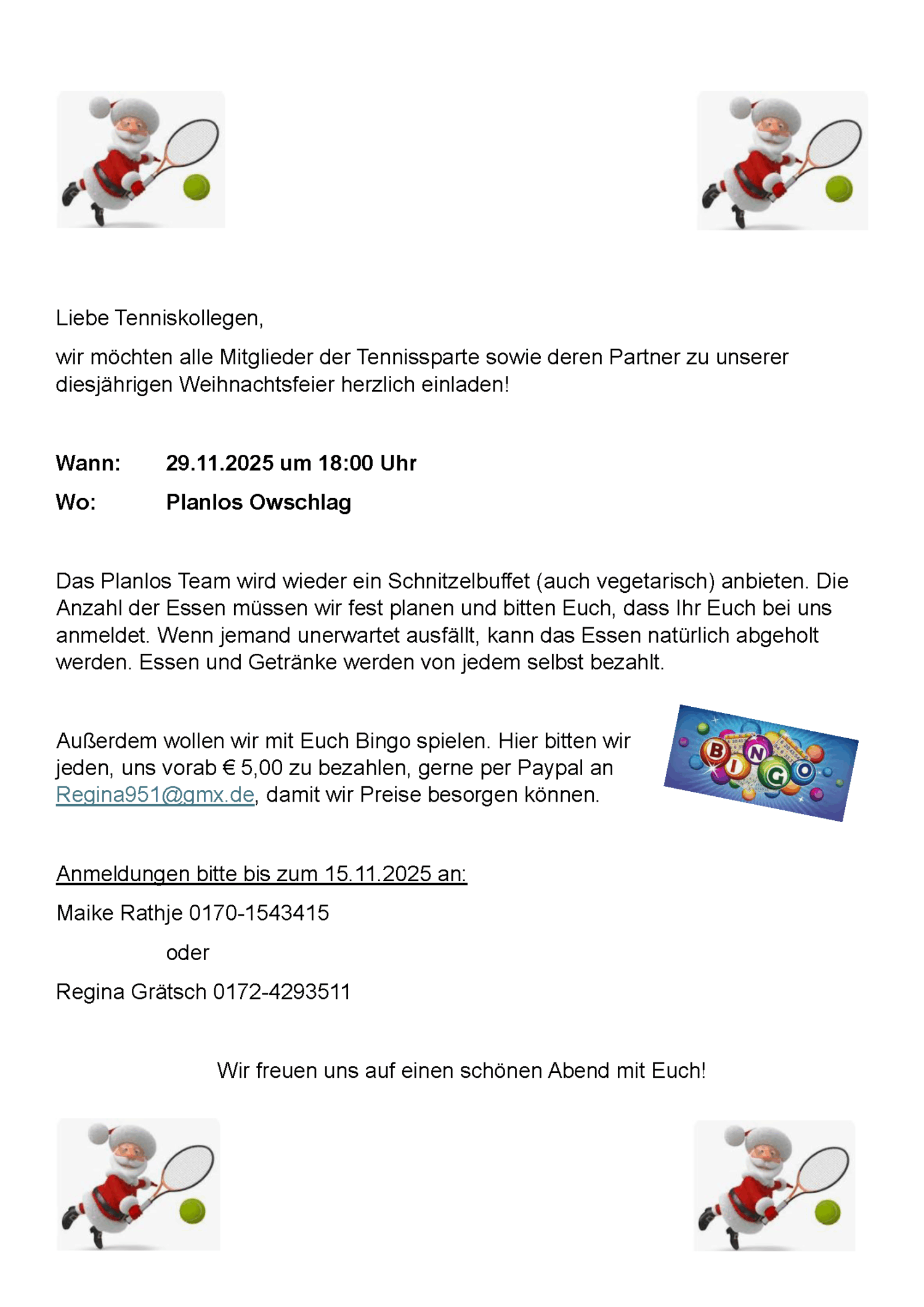 Liebe Tennisfreunde des TSV Owschlag. Am Samstag, dem 29.11.2025 findet unsere diesjährige Weihnachtsfeier statt. Beginn ist um 18.oo Uhr im Total Planlos, Bahnhofstraße 15 statt. Weitere Informationen entnehmt bitte dem Bild.